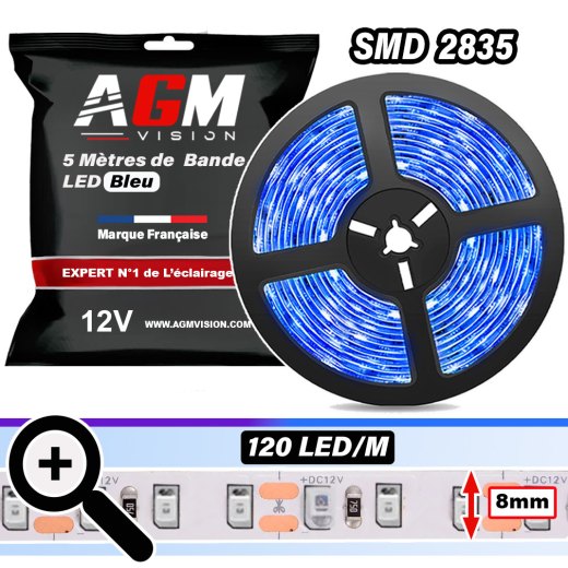 5 metros de tira LED 12 voltios, IP20 para interior de color Azul. Esta tira LED está equipada con 120 chips SMD 2835 por metro (si desea cortar la tira, esto se puede hacer cada 3 chips LED en el lugar indicado). Cabe señalar que estas tiras LED no son impermeables y por lo tanto deben instalarse en elinterior o en lugares protegidos de la humedad. Para instalar estas tiras LED, prevea un alojamiento de al menos 8mm de ancho.
