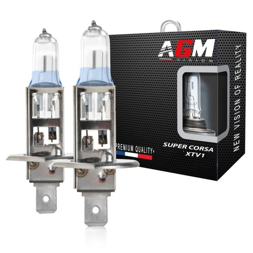 2個のH1 55Wバルブ、超高性能で、現在市場で最高クラスの製品です(比較テストあり)。照明色は3700Kで、純正よりわずかに白く、道路上の視認性が大幅に向上します。
