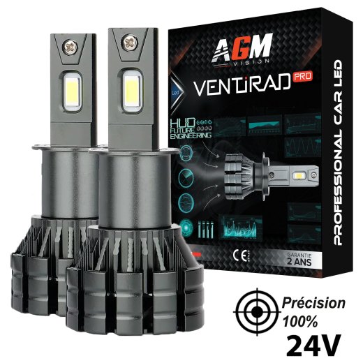 La LED H3 Ventirad PRO 24V rassemble toutes les qualités les plus recherchées par les routiers pour un éclairage de qualité : puissant, précis, avec une densité et une couverture lumineuse impressionnantes. Dimension très compacte : à peine 32 mm de diamètre, facile à installer, dotée d'une bague de montage 360° et d'une connectique H3 Plug&Play. La LED H3 Ventirad Pro est une All in One avec ventilateur de refroidissement et module Can-Bus intégré. Celle-ci possède un bon niveau d'anti-erreur de base mais peut être améliorée à l'aide d'un module Can-PRO H7 additionnel pour renforcer son efficacité notamment pour les véhicules très récents et premium de type : Mercedes, SCANIA, VOLVO, DAF etc.
