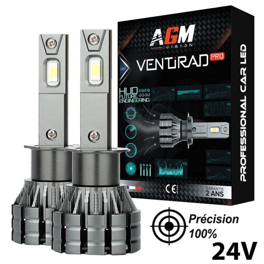 La LED H1 Ventirad PRO 24V rassemble toutes les qualités les plus recherchées par les routiers pour un éclairage de qualité : puissant, précis avec une densité et une couverture lumineuse impressionnantes. Dimension très compacte à peine 32mm de diamètre, facile à installer et dotée d'une bague de montage 360°, connectique H7 Plug&Play. La LED H1 Ventirad Pro est une All in One avec ventilateur de refroidissement et module Can-Bus intégré. Celle-ci possède un bon niveau d'anti-erreur de base mais peut être améliorée à l'aide d'unmodule Can-PRO H1 additionnel pour renforcer son efficacité notamment pour les véhicules très récents et premium type : Mercedes, SCANIA, VOLVO, DAF etc.